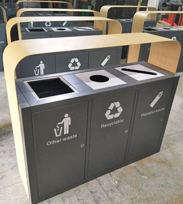欣方圳三分類仿木紋鋼制烤漆垃圾桶批量生產圖