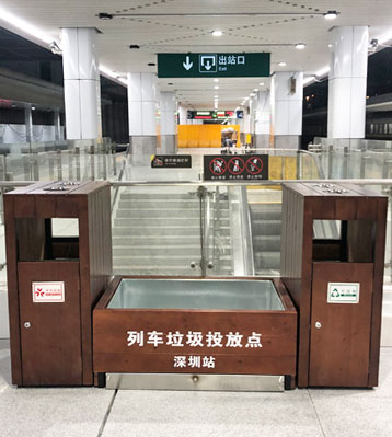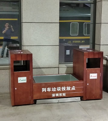 欣方圳列車站臺(tái)仿木花箱組合垃圾桶深圳東站實(shí)景圖